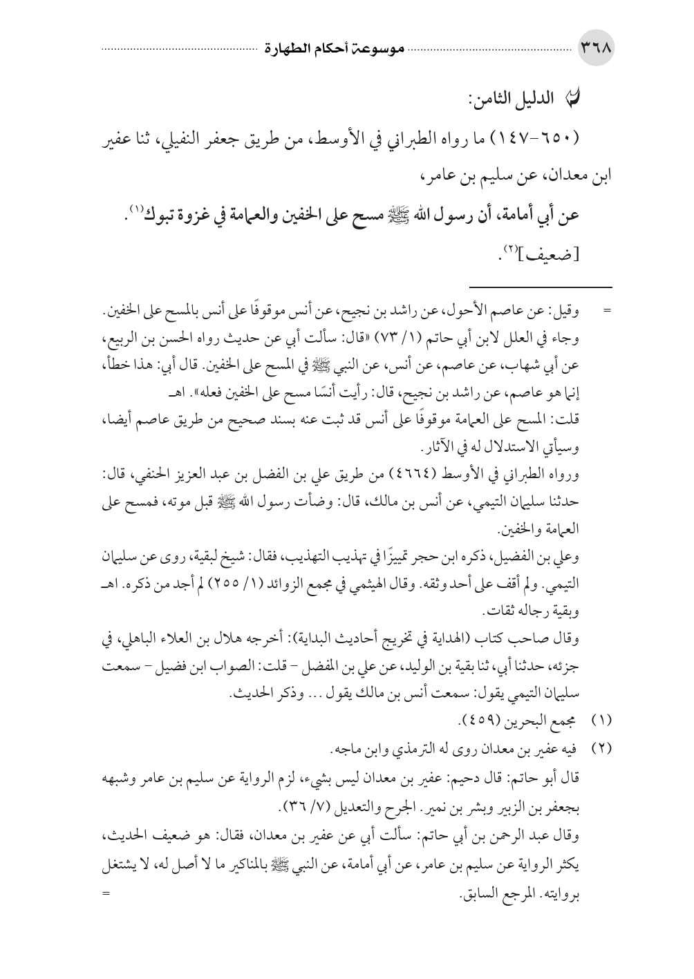 (٦٥٠ - ١٤٧) ما رواه الطبراني في الأوسط، من طريق جعفر النفيلي، ثنا عفير ابن معدان، عن سليم بن عامر،