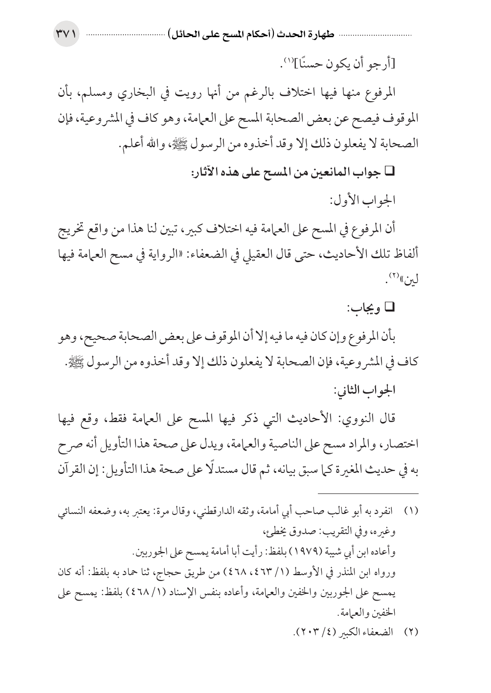 أن المرفوع في المسح على العمامة فيه اختلاف كبير، تبين لنا هذا من واقع تخريج ألفاظ تلك الأحاديث، حتى قال العقيلي في الضعفاء: «الرواية في مسح العمامة فيها لين» (¬٢).