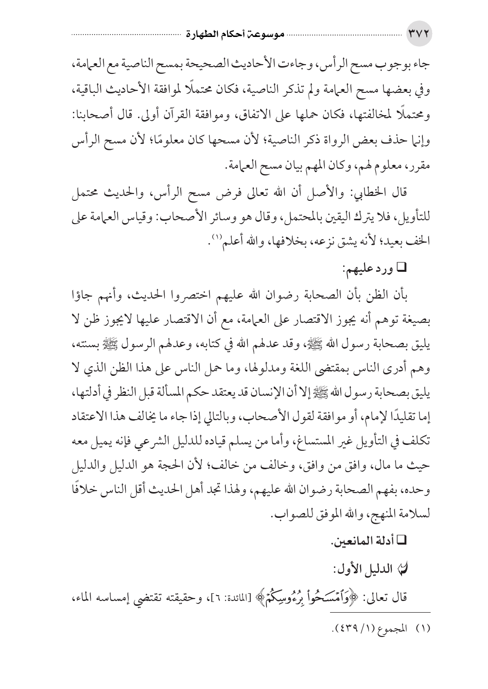 بأن الظن بأن الصحابة رضوان الله عليهم اختصروا الحديث، وأنهم جاؤا بصيغة توهم أنه يجوز الاقتصار على العمامة، مع أن الاقتصار عليها لايجوز ظن لا يليق بصحابة رسول الله صلى الله عليه وسلم، وقد عدلهم الله في كتابه، وعدلهم الرسول صلى الله عليه وسلم بسنته، وهم أدرى الناس بمقتضى اللغة ومدلولها، وما حمل الناس على هذا الظن الذي لا يليق بصحابة رسول الله صلى الله عليه وسلم إلا أن الإنسان قد يعتقد حكم المسألة قبل النظر في أدلتها، إما تقليدًا لإمام، أو موافقة لقول الأصحاب، وبالتالي إذا جاء ما يخالف هذا الاعتقاد تكلف في التأويل غير المستساغ، وأما من يسلم قياده للدليل الشرعي فإنه يميل معه حيث ما مال، وافق من وافق، وخالف من خالف؛ لأن الحجة هو الدليل والدليل وحده، بفهم الصحابة رضوان الله عليهم، ولهذا تجد أهل الحديث أقل الناس خلافًا لسلامة المنهج، والله الموفق للصواب.