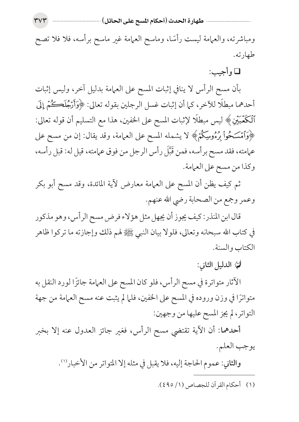 بأن مسح الرأس لا ينافي إثبات المسح على العمامة بدليل آخر، وليس إثبات أحدهما مبطلًا للآخر، كما أن إثبات غسل الرجلين بقوله تعالى: (وَأَرْجُلَكُمْ إِلَى الْكَعْبَينِ) ليس مبطلًا لإثبات المسح على الخفين، هذا مع التسليم أن قوله تعالى: (وَامْسَحُوا بِرُؤُوسِكُمْ) لا يشمله المسح على العمامة، وقد يقال: إن من مسح على عمامته، فقد مسح برأسه، فمن قَبَّلَ رأس الرجل من فوق عمامته، قيل له: قبل رأسه، وكذا من مسح على العمامة.