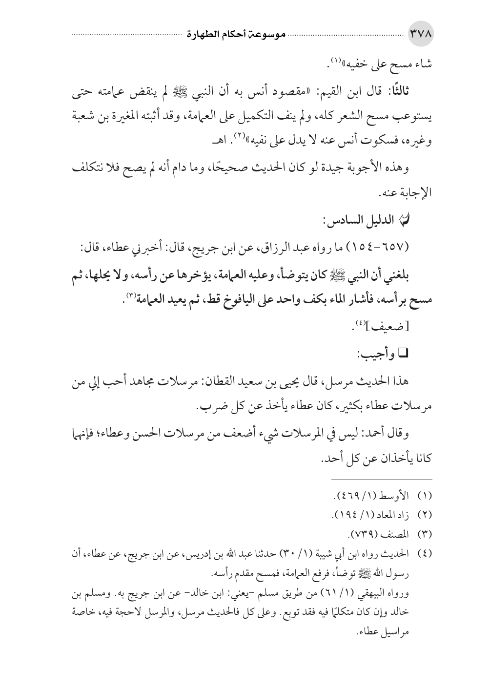 (¬٤) الحديث رواه ابن أبي شيبة (١/ ٣٠) حدثنا عبد الله بن إدريس، عن ابن جريج، عن عطاء، أن رسول الله صلى الله عليه وسلم توضأ، فرفع العمامة، فمسح مقدم رأسه.