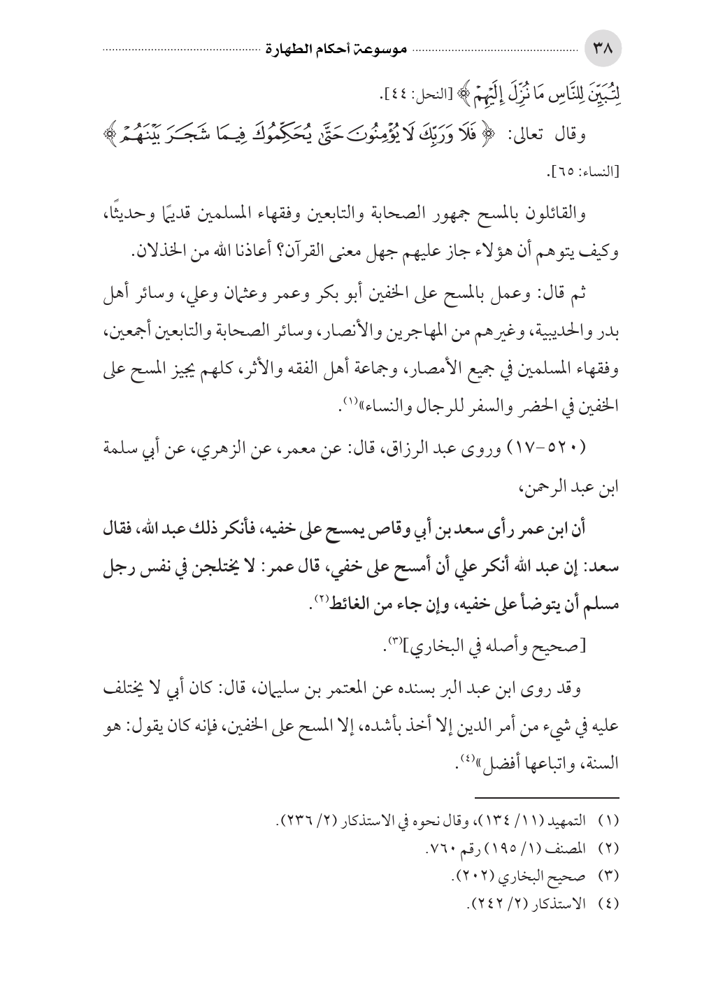 ثم قال: وعمل بالمسح على الخفين أبو بكر وعمر وعثمان وعلي، وسائر أهل بدر والحديبية، وغيرهم من المهاجرين والأنصار، وسائر الصحابة والتابعين أجمعين، وفقهاء المسلمين في جميع الأمصار، وجماعة أهل الفقه والأثر، كلهم يجيز المسح على الخفين في الحضر والسفر للرجال والنساء» (¬١).