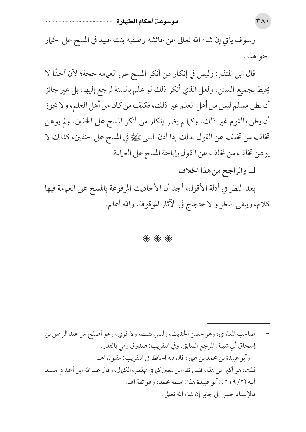 قال ابن المنذر: وليس في إنكار من أنكر المسح على العمامة حجة؛ لأن أحدًا لا يحيط بجميع السنن، ولعل الذي أنكر ذلك لو علم بالسنة لرجع إليها، بل غير جائز أن يظن مسلم ليس من أهل العلم غير ذلك، فكيف من كان من أهل العلم، ولا يجوز أن يظن بالقوم غير ذلك، وكما لم يضر إنكار من أنكر المسح على الخفين، ولم يوهن تخلف من تخلف عن القول بذلك إذا أذن النبي صلى الله عليه وسلم في المسح على الخفين، كذلك لا يوهن تخلف من تخلف عن القول بإباحة المسح على العمامة.