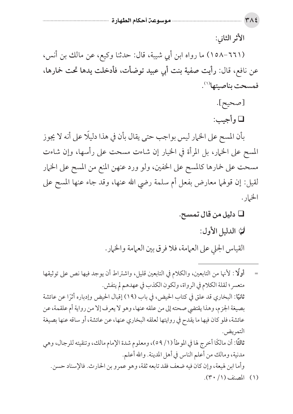 (٦٦١ - ١٥٨) ما رواه ابن أبي شيبة، قال: حدثنا وكيع، عن مالك بن أنس، عن نافع، قال: رأيت صفية بنت أبي عبيد توضأت، فأدخلت يدها تحت خمارها، فمسحت بناصيتها (¬١).