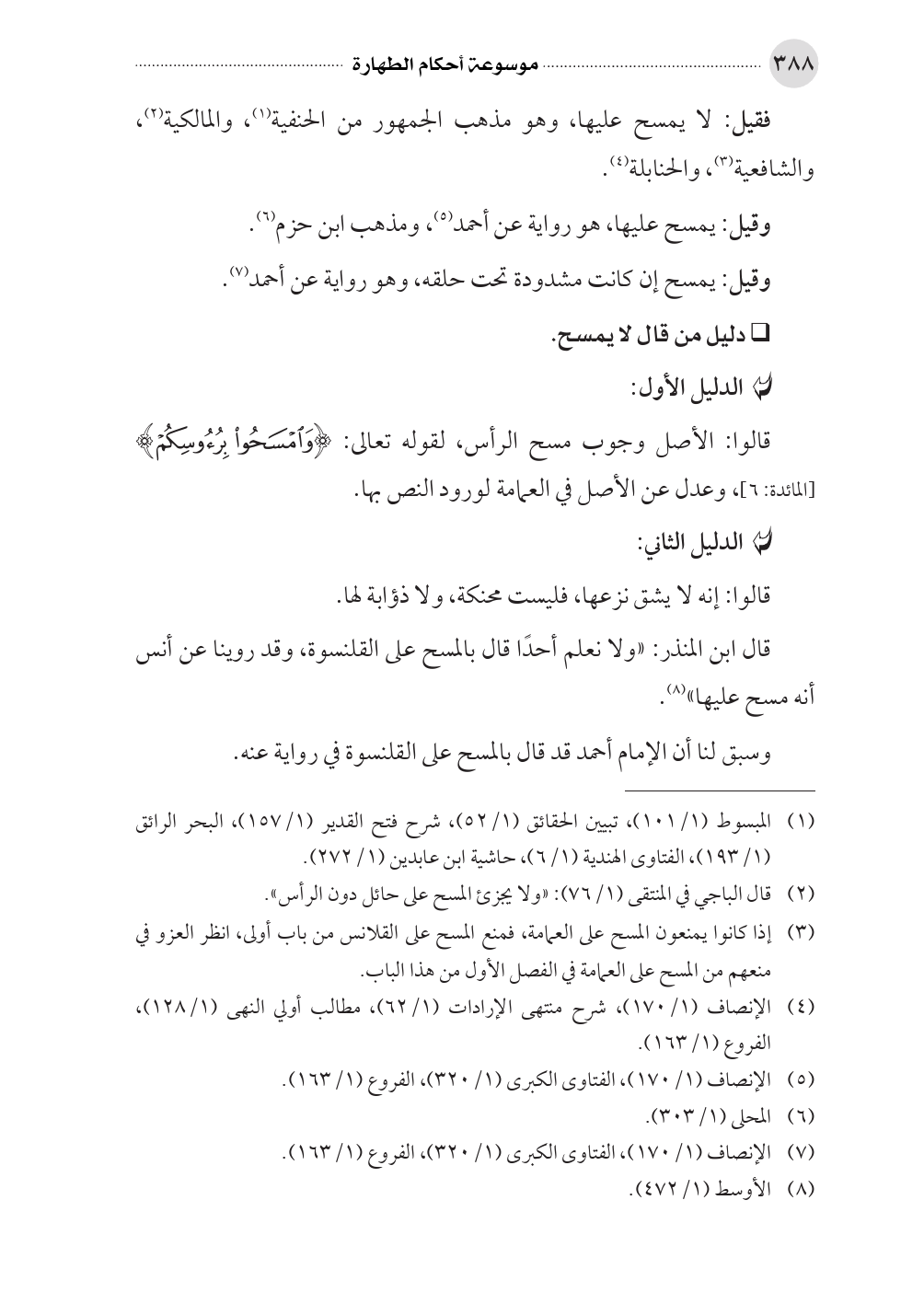 (¬٣) إذا كانوا يمنعون المسح على العمامة، فمنع المسح على القلانس من باب أولى، انظر العزو في منعهم من المسح على العمامة في الفصل الأول من هذا الباب.
