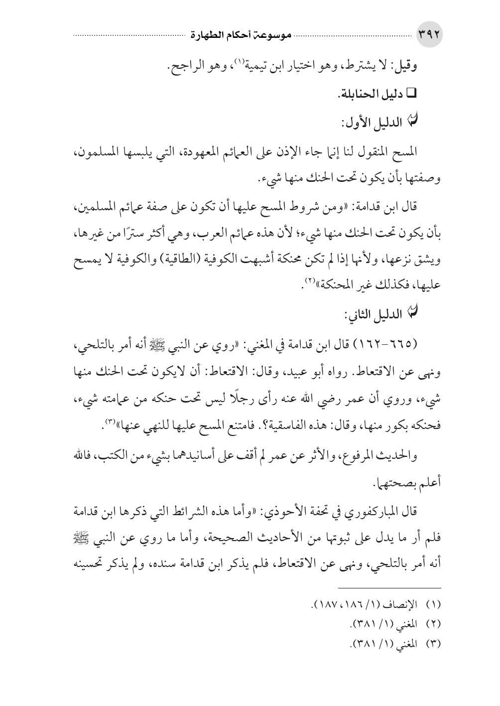 (٦٦٥ - ١٦٢) قال ابن قدامة في المغني: «روي عن النبي صلى الله عليه وسلم أنه أمر بالتلحي، ونهى عن الاقتعاط. رواه أبو عبيد، وقال: الاقتعاط: أن لايكون تحت الحنك منها شيء، وروي أن عمر رضي الله عنه رأى رجلًا ليس تحت حنكه من عمامته شيء، فحنكه بكور منها، وقال: هذه الفاسقية؟. فامتنع المسح عليها للنهي عنها» (¬٣).