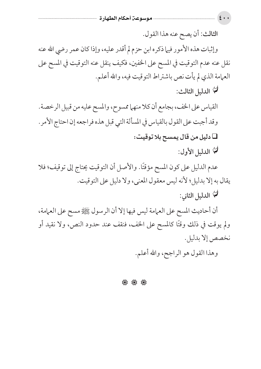 عدم الدليل على كون المسح مؤقتًا. والأصل أن التوقيت يحتاج إلى توقيف؛ فلا يقال به إلا بدليل؛ لأنه ليس معقول المعنى، ولا دليل على التوقيت.