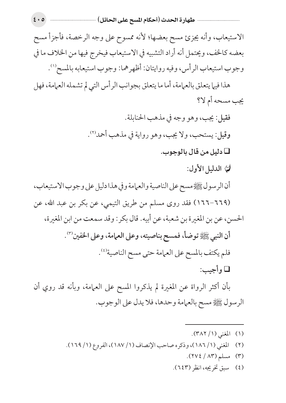 بأن أكثر الرواة عن المغيرة لم يذكروا المسح على العمامة، وبأنه قد روي أن الرسول صلى الله عليه وسلم مسح بالعمامة وحدها، فلا يدل على الوجوب.