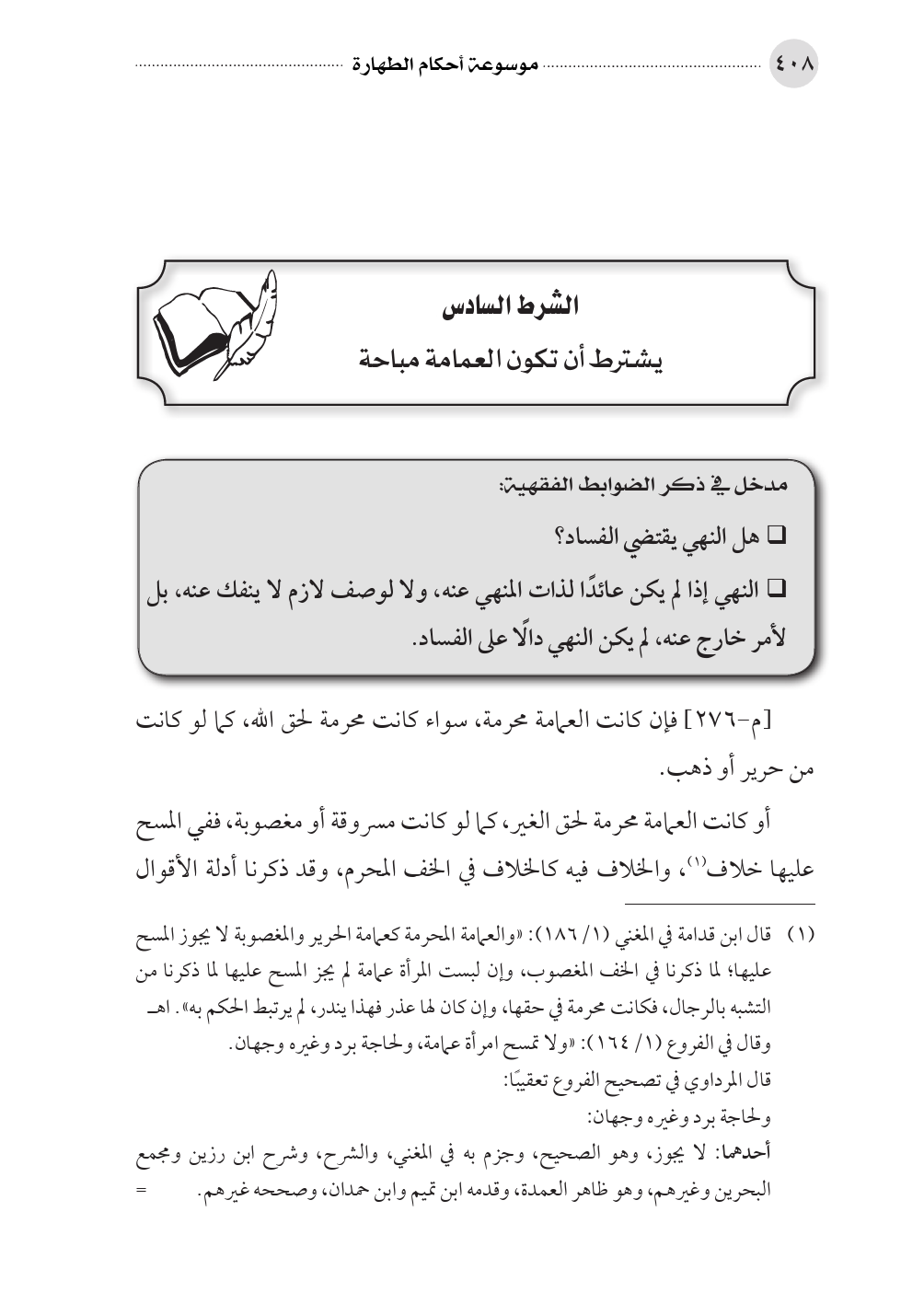 (¬١) قال ابن قدامة في المغني (١/ ١٨٦): «والعمامة المحرمة كعمامة الحرير والمغصوبة لا يجوز المسح عليها؛ لما ذكرنا في الخف المغصوب، وإن لبست المرأة عمامة لم يجز المسح عليها لما ذكرنا من التشبه بالرجال، فكانت محرمة في حقها، وإن كان لها عذر فهذا يندر، لم يرتبط الحكم به». اهـ