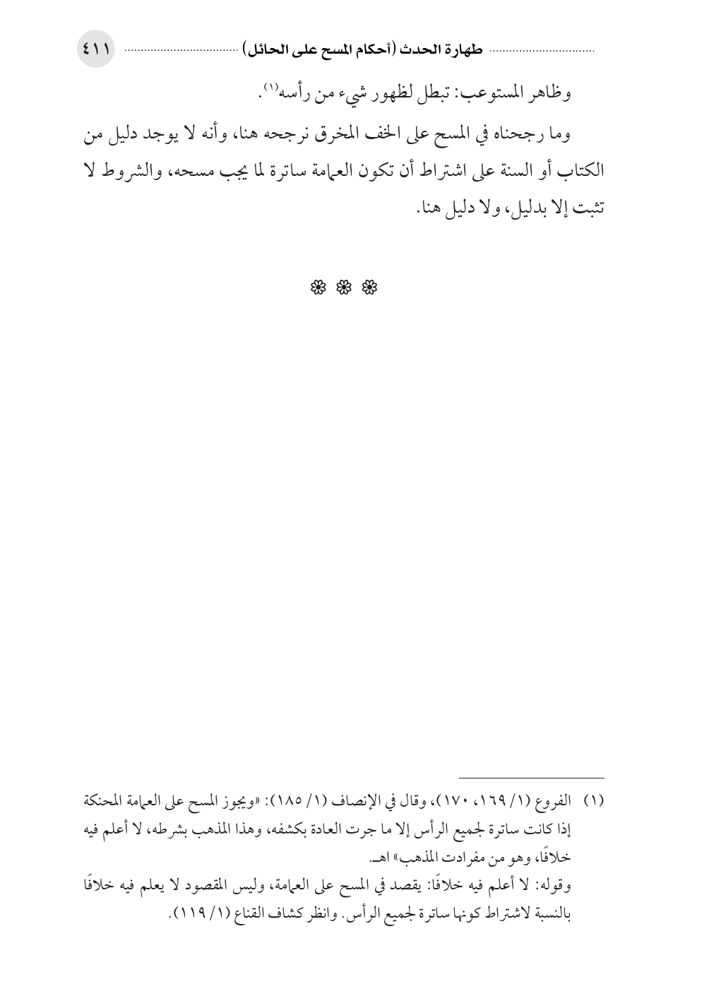 (¬١) الفروع (١/ ١٦٩، ١٧٠)، وقال في الإنصاف (١/ ١٨٥): «ويجوز المسح على العمامة المحنكة إذا كانت ساترة لجميع الرأس إلا ما جرت العادة بكشفه، وهذا المذهب بشرطه، لا أعلم فيه خلافًا، وهو من مفرادت المذهب» اهـ.