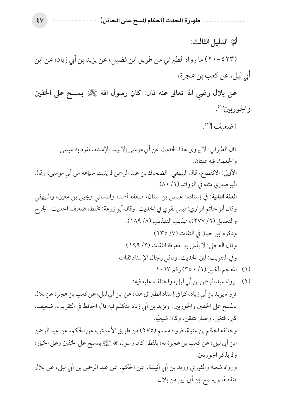 فرواه يزيد بن أبي زياد، كما في إسناد الطبراني هذا، عن ابن أبي ليلى، عن كعب بن عجرة عن بلال بالمسح على الخفين والجوربين. ويزيد بن أبي زياد متكلم فيه قال الحافظ في التقريب: ضعيف، كبر، فتغير، وصار يتلقن، وكان شيعيًا.