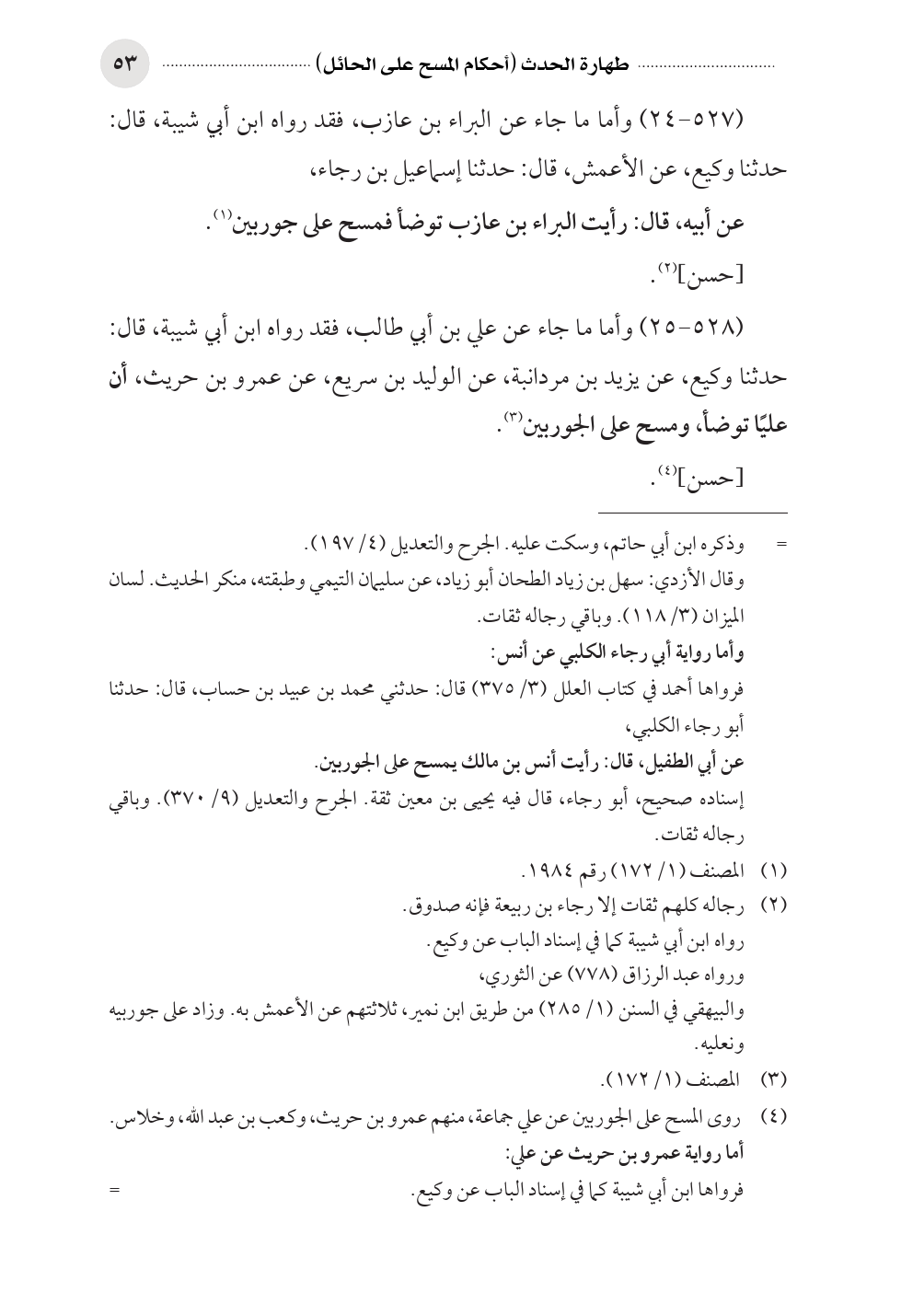 (٥٢٨ - ٢٥) وأما ما جاء عن علي بن أبي طالب، فقد رواه ابن أبي شيبة، قال: حدثنا وكيع، عن يزيد بن مردانبة، عن الوليد بن سريع، عن عمرو بن حريث، أن عليًا توضأ، ومسح على الجوربين (¬٣).