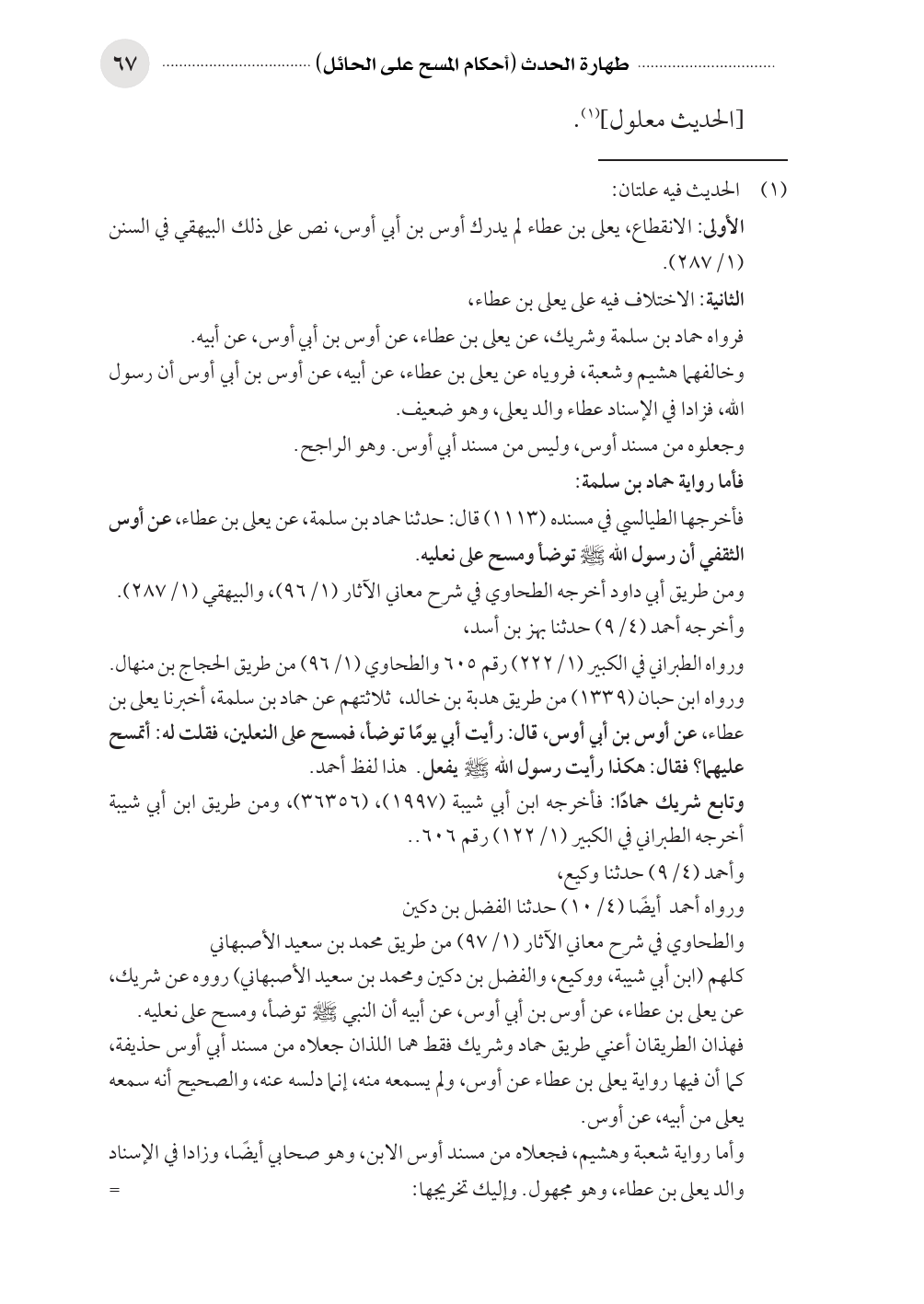 ورواه ابن حبان (١٣٣٩) من طريق هدبة بن خالد، ثلاثتهم عن حماد بن سلمة، أخبرنا يعلى بن عطاء، عن أوس بن أبي أوس، قال: رأيت أبي يومًا توضأ، فمسح على النعلين، فقلت له: أتمسح عليهما؟ فقال: هكذا رأيت رسول الله صلى الله عليه وسلم يفعل. هذا لفظ أحمد.