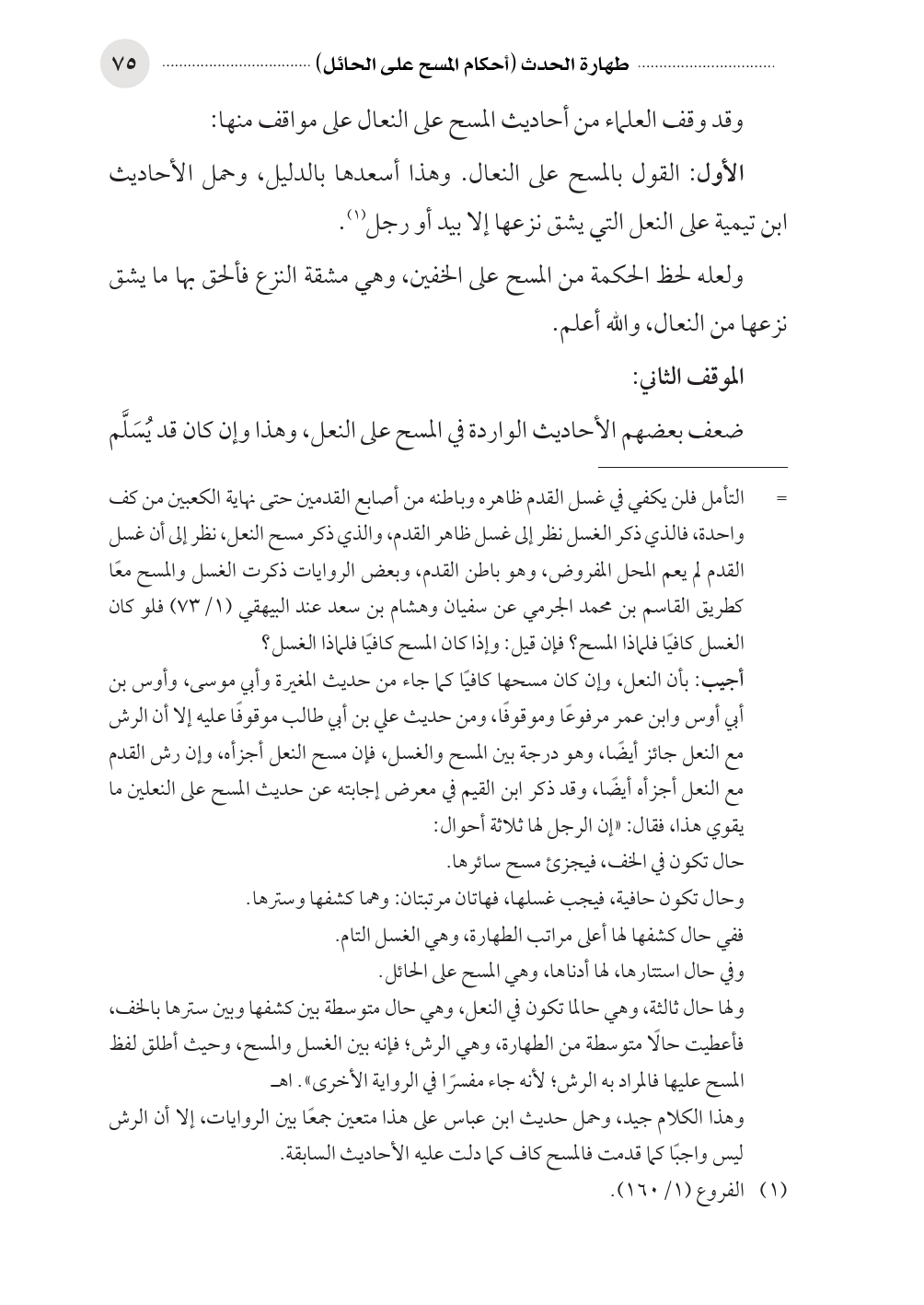 = التأمل فلن يكفي في غسل القدم ظاهره وباطنه من أصابع القدمين حتى نهاية الكعبين من كف واحدة، فالذي ذكر الغسل نظر إلى غسل ظاهر القدم، والذي ذكر مسح النعل، نظر إلى أن غسل القدم لم يعم المحل المفروض، وهو باطن القدم، وبعض الروايات ذكرت الغسل والمسح معًا كطريق القاسم بن محمد الجرمي عن سفيان وهشام بن سعد عند البيهقي (١/ ٧٣) فلو كان الغسل كافيًا فلماذا المسح؟ فإن قيل: وإذا كان المسح كافيًا فلماذا الغسل؟