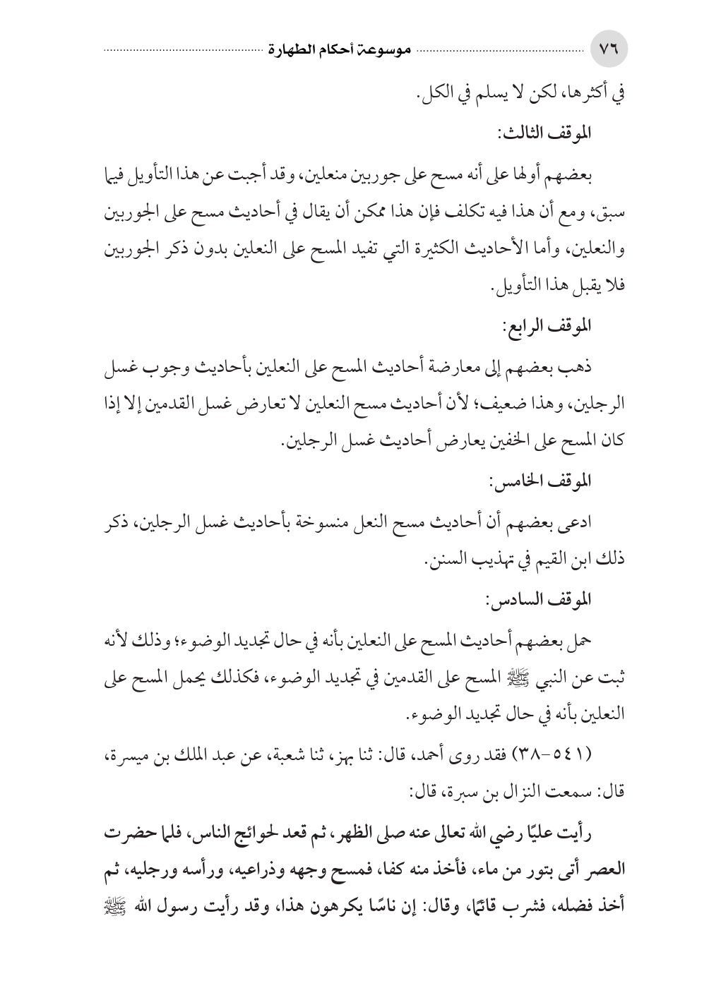 رأيت عليًا رضي الله تعالى عنه صلى الظهر، ثم قعد لحوائج الناس، فلما حضرت العصر أتى بتور من ماء، فأخذ منه كفا، فمسح وجهه وذراعيه، ورأسه ورجليه، ثم أخذ فضله، فشرب قائمًا، وقال: إن ناسًا يكرهون هذا، وقد رأيت رسول الله صلى الله عليه وسلم