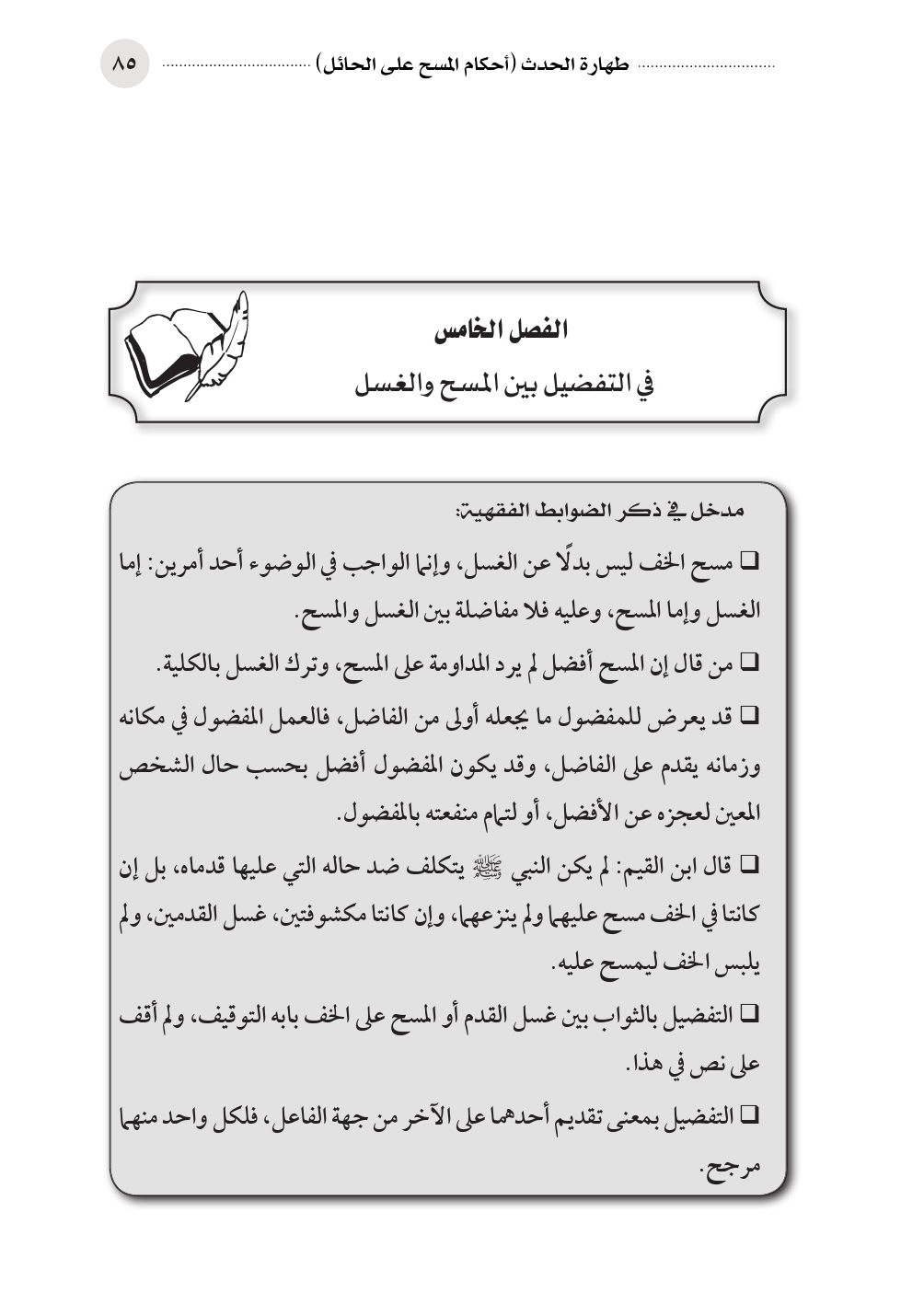 • مسح الخف ليس بدلًا عن الغسل، وإنما الواجب في الوضوء أحد أمرين: إما الغسل وإما المسح، وعليه فلا مفاضلة بين الغسل والمسح.