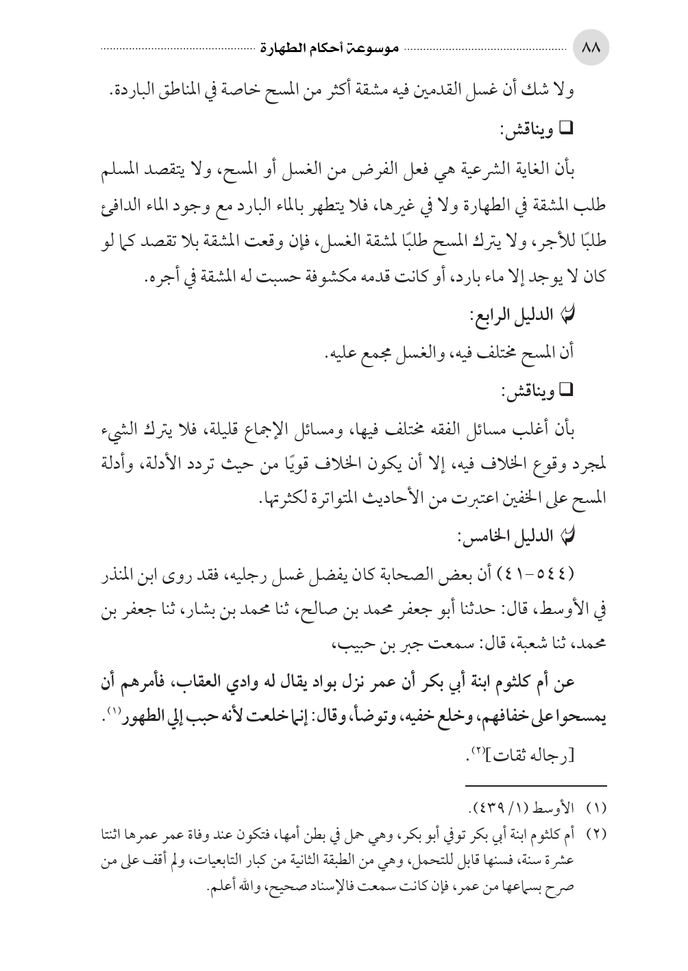 بأن أغلب مسائل الفقه مختلف فيها، ومسائل الإجماع قليلة، فلا يترك الشيء لمجرد وقوع الخلاف فيه، إلا أن يكون الخلاف قويًا من حيث تردد الأدلة، وأدلة المسح على الخفين اعتبرت من الأحاديث المتواترة لكثرتها.