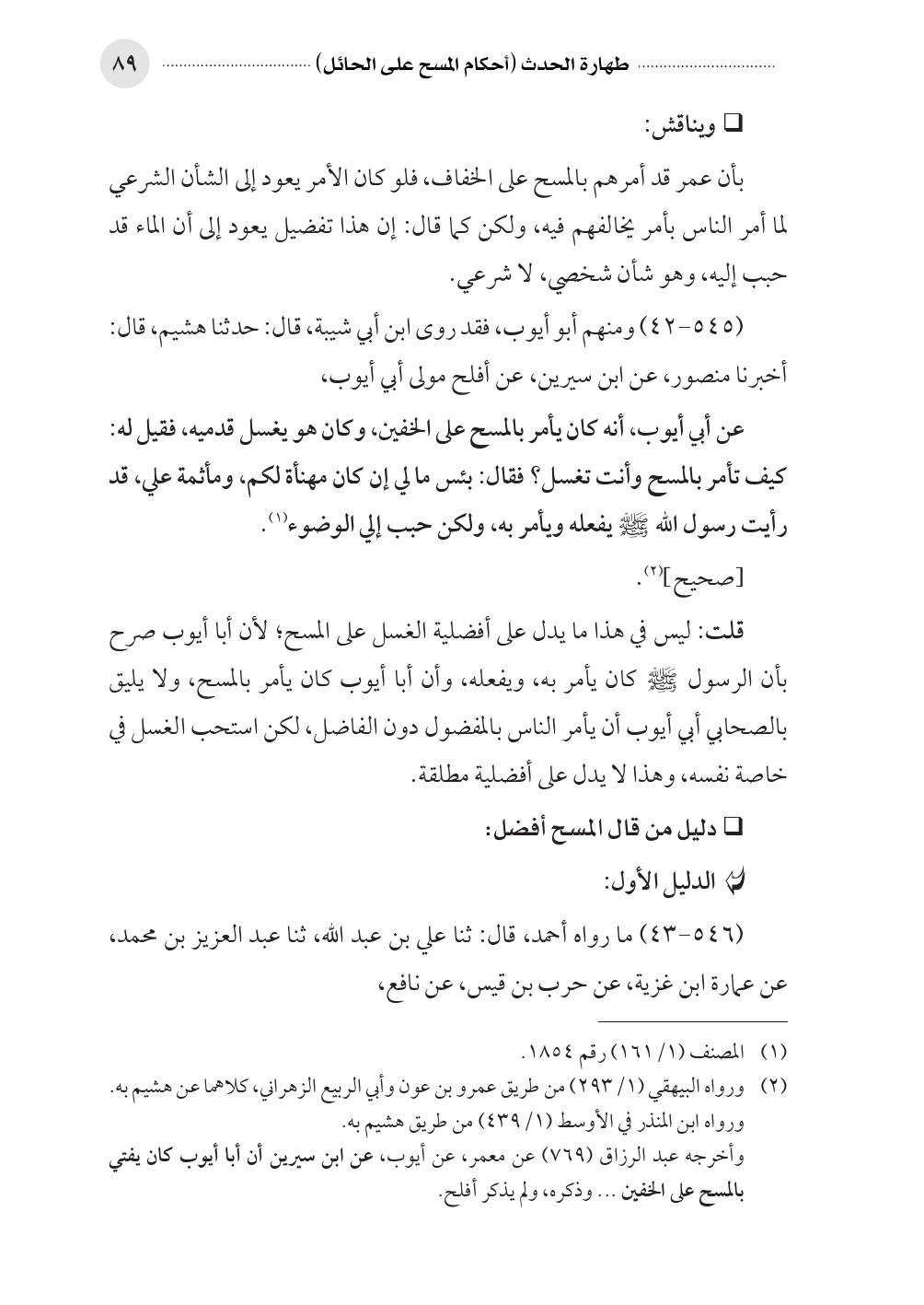 (٥٤٥ - ٤٢) ومنهم أبو أيوب، فقد روى ابن أبي شيبة، قال: حدثنا هشيم، قال: أخبرنا منصور، عن ابن سيرين، عن أفلح مولى أبي أيوب، عن أبي أيوب، أنه كان يأمر بالمسح على الخفين، وكان هو يغسل قدميه، فقيل له: كيف تأمر بالمسح وأنت تغسل؟ فقال: بئس ما لي إن كان مهنأة لكم، ومأثمة علي، قد رأيت رسول الله صلى الله عليه وسلم يفعله ويأمر به، ولكن حبب إلي الوضوء (¬١).