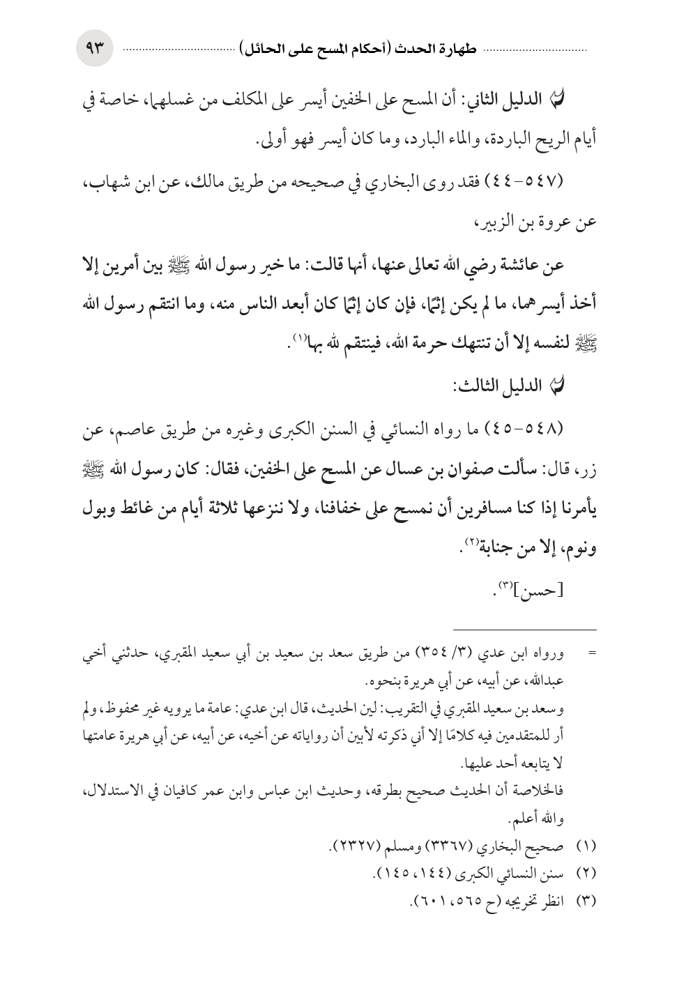 (٥٤٨ - ٤٥) ما رواه النسائي في السنن الكبرى وغيره من طريق عاصم، عن زر، قال: سألت صفوان بن عسال عن المسح على الخفين، فقال: كان رسول الله صلى الله عليه وسلم يأمرنا إذا كنا مسافرين أن نمسح على خفافنا، ولا ننزعها ثلاثة أيام من غائط وبول ونوم، إلا من جنابة (¬٢).