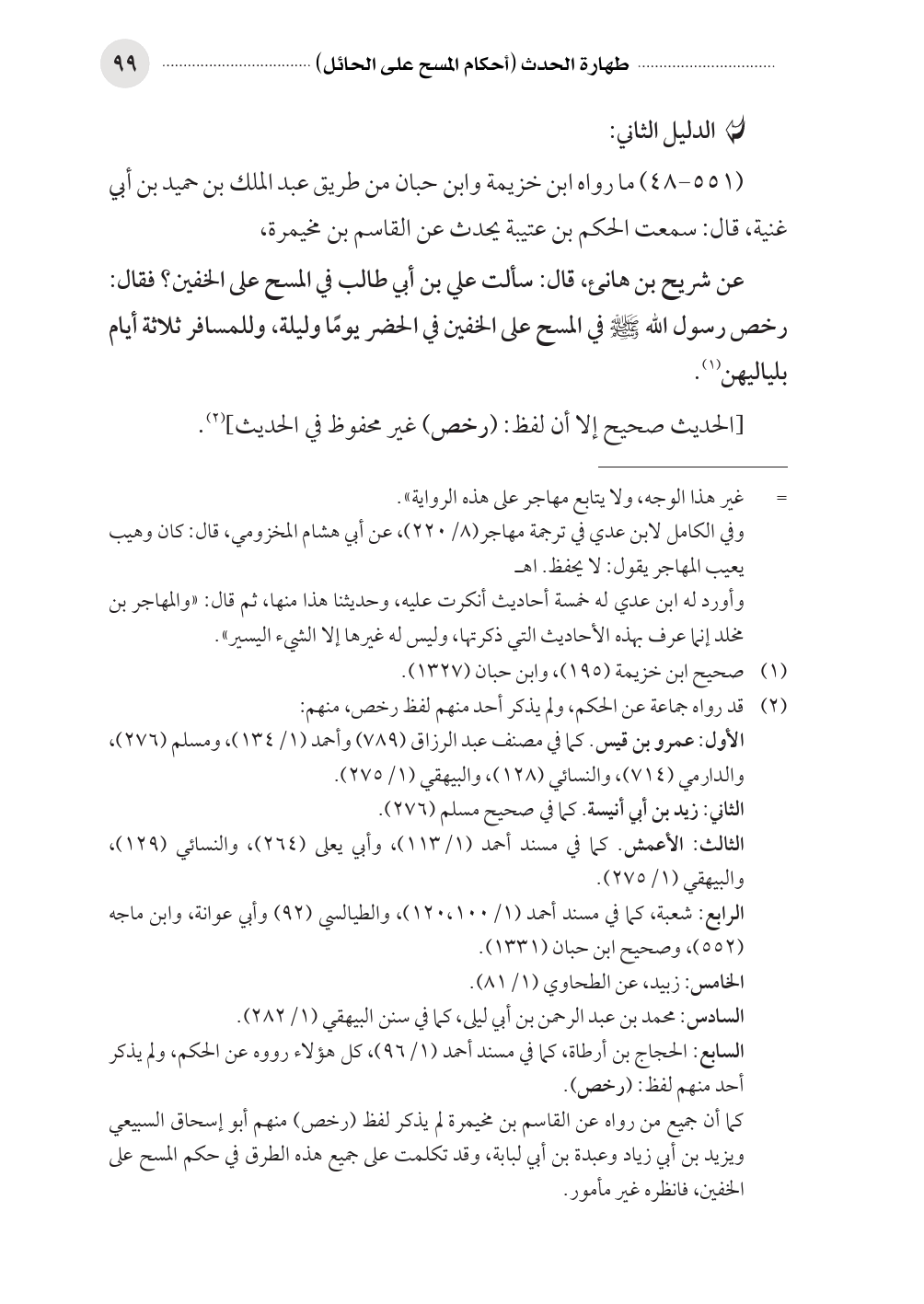 عن شريح بن هانئ، قال: سألت علي بن أبي طالب في المسح على الخفين؟ فقال: رخص رسول الله صلى الله عليه وسلم في المسح على الخفين في الحضر يومًا وليلة، وللمسافر ثلاثة أيام بلياليهن (¬١).