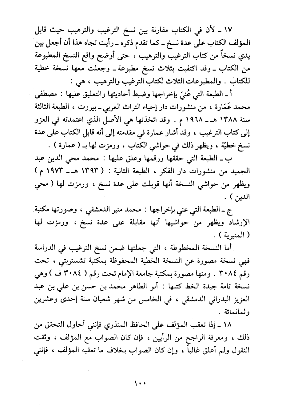 ١٧ - لأن في الكتاب مقارنة بين نسخ الترغيب والترهيب حيث قابل المؤلف الكتاب على عدة نسخ -كما تقدم ذكره- رأيت تجاه هذا أن أجعل بين يدي نسخاً من كتاب الترغيب والترهيب، حتى أوضح واقع النسخ المطبوعة من الكتاب -وقد اكتفيت بثلاث نسخ مطبوعة- وجعلت معها نسخة خطية للكتاب. والمطبوعات الثلاث لكتاب الترغيب والترهيب، هي: