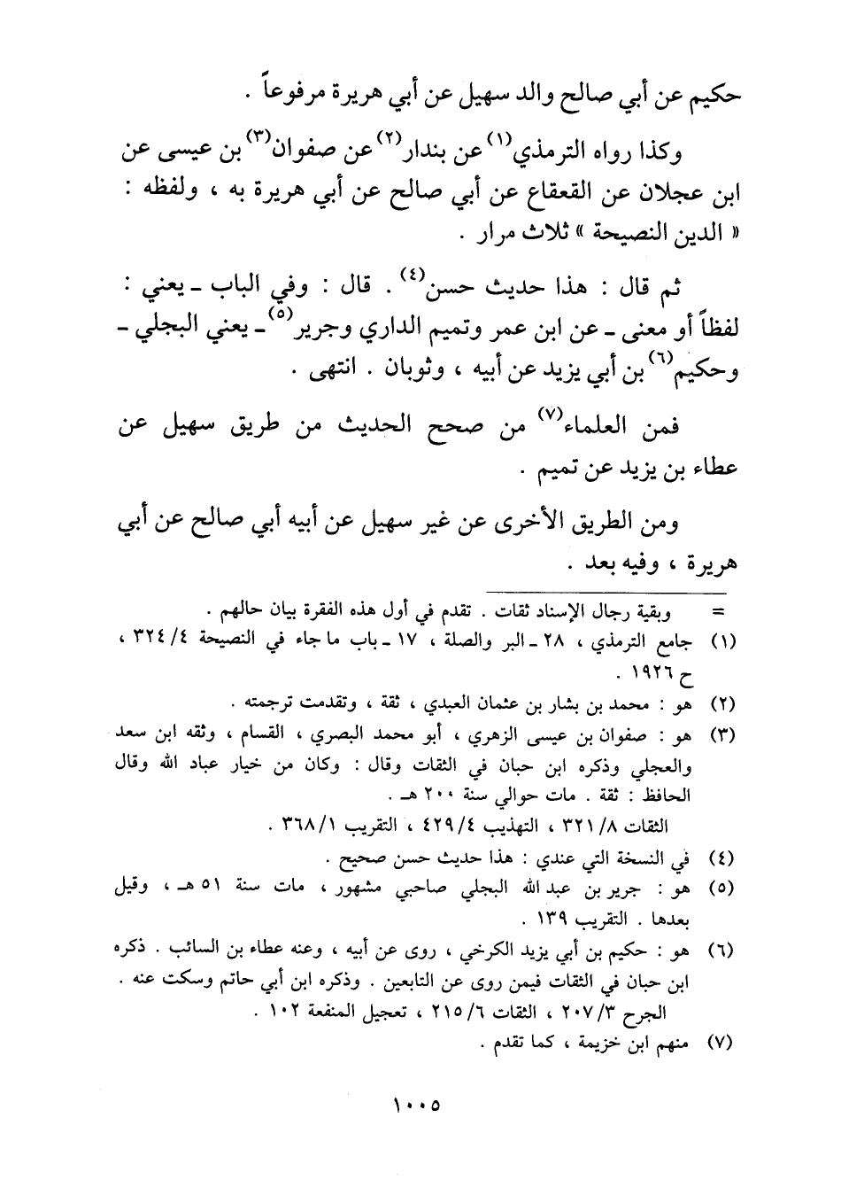 وكذا رواه الترمذي عن بندار عن صفوان بن عيسى عن ابن عجلان عن القعقاع عن أبي صالح عن أبي هريرة به، ولفظه: "الدين النصيحة" ثلاث مرار.