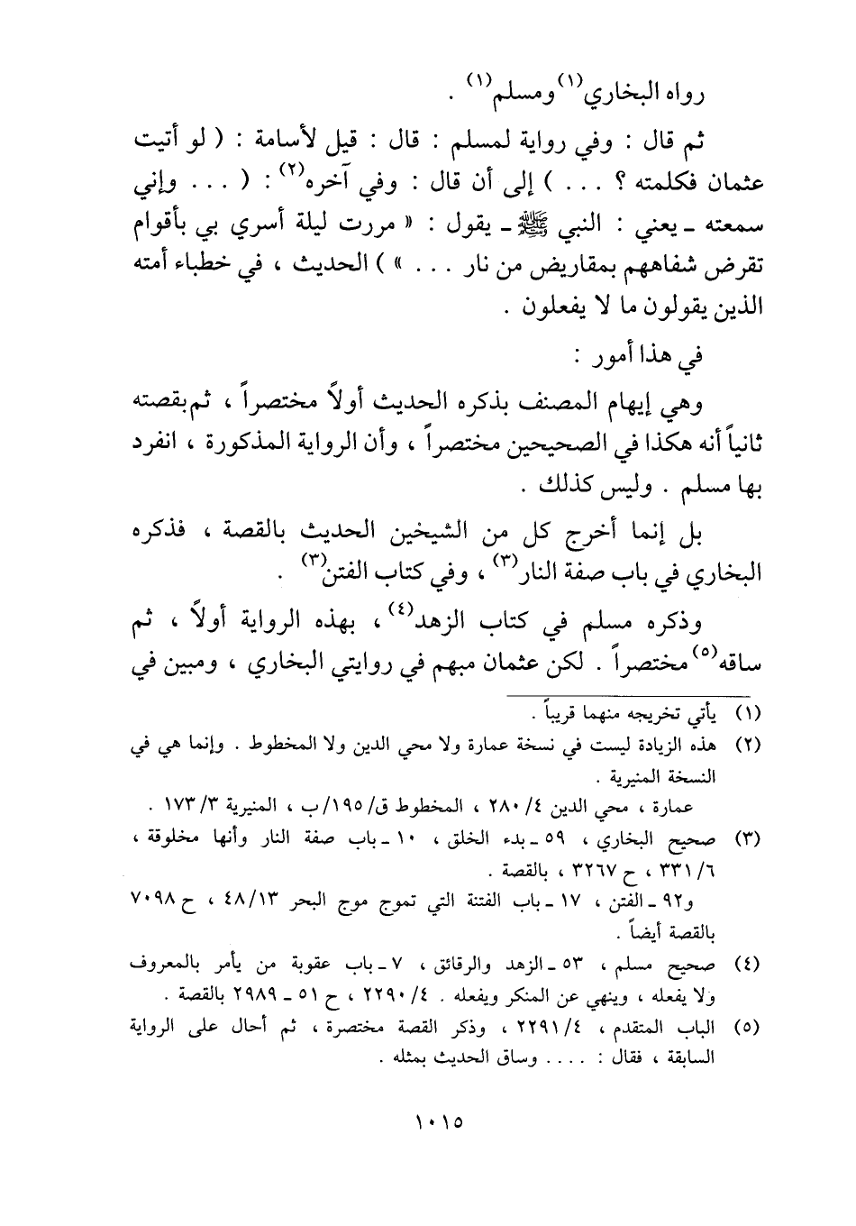 ثم قال: وفي رواية لمسلم: قال: قيل لأسامة: (لو أتيت عثمان فكلمته؟ ... ) إلى أن قال: وفي آخره: ( ... وإني سمعته -يعني: النبي - صلى الله عليه وسلم - يقول: "مررت ليلة أسري بي بأقوام تقرض شفاههم بمقاريض من نار ... ") الحديث، في خطباء أمته الذين يقولون ما لا يفعلون.