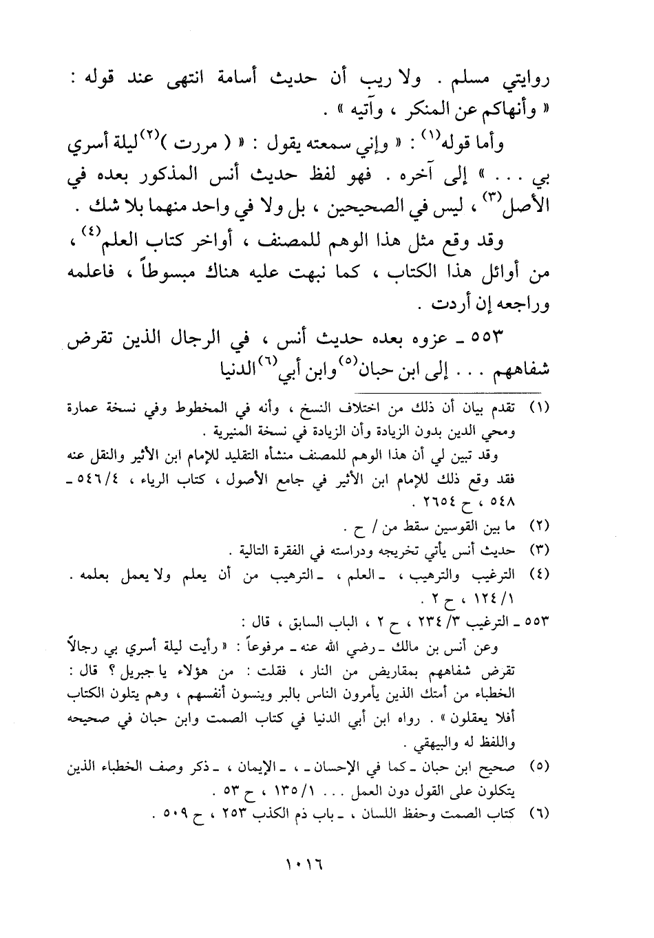 ٥٥٣ - عزوه بعده حديث أنس، في الرجال الذين تقرض شفاههم ... إلى ابن حبان وابن أبي الدنيا.