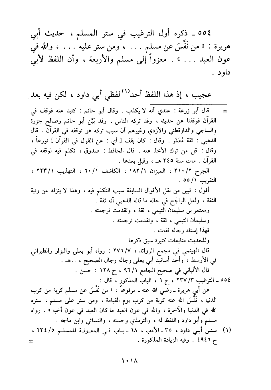 ٥٥٤ - ذكره أول الترغيب في ستر المسلم، حديث أبي هريرة: "من نَفَّسَ عن مسلم ... ، ومن ستر عليه ... ، والله في عون العبد ... ". معزواً إلى مسلم والأربعة، وأن اللفظ لأبي داود.