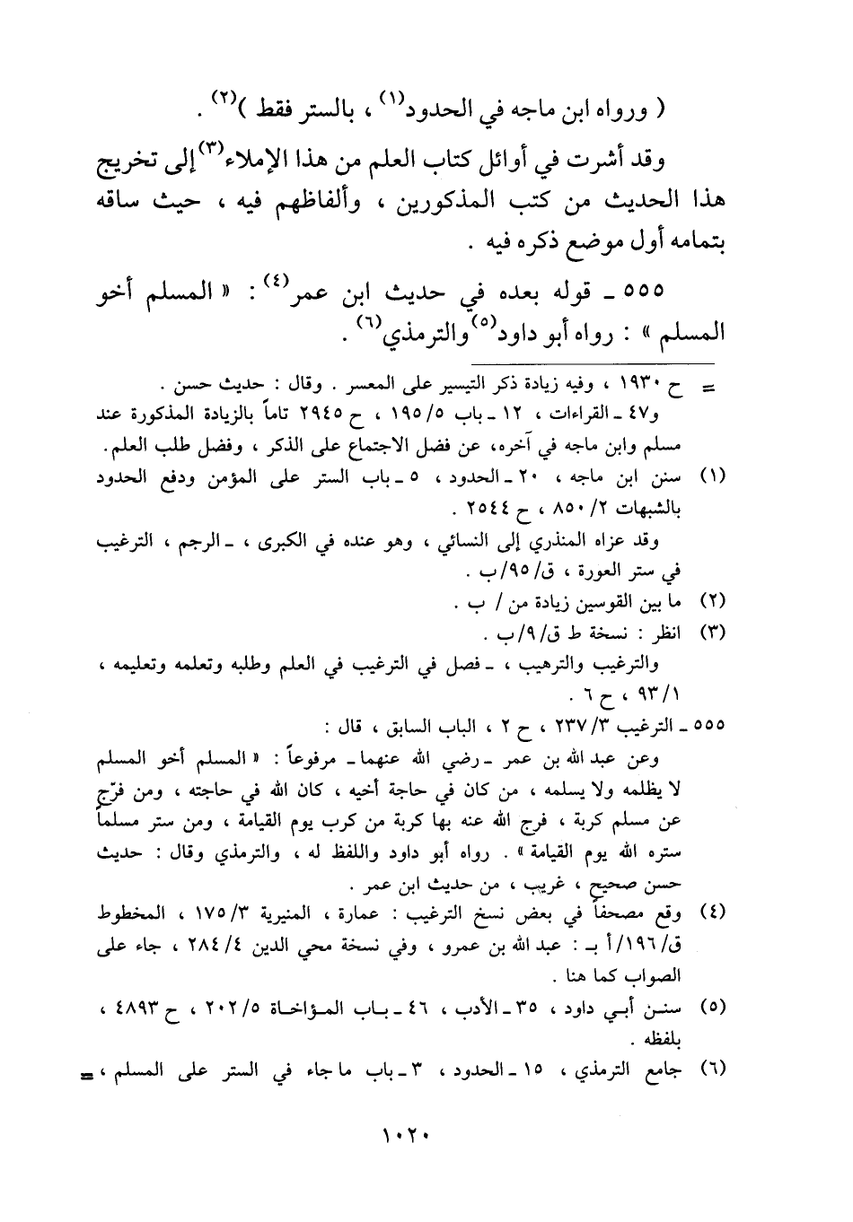 ٥٥٥ - قوله بعده في حديث ابن عمر: "المسلم أخو المسلم": رواه أبو داود والترمذي.