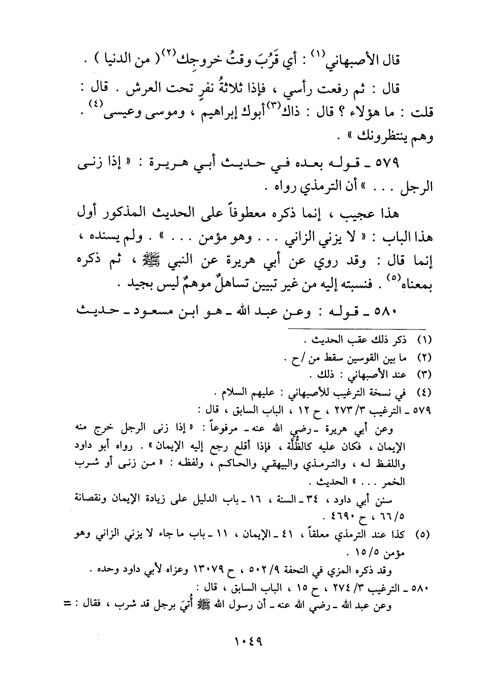 هذا عجيب، إنما ذكره معطوفاً على الحديث المذكور أول هذا الباب: "لا يزني الزاني ... وهو مؤمن ... ". ولم يسنده، إنما قال: وقد روي عن أبي هريرة عن النبي - صلى الله عليه وسلم -، ثم ذكره بمعناه. فنسبته إليه من غير تبيين تساهلٌ موهمٌ ليس بجيد.