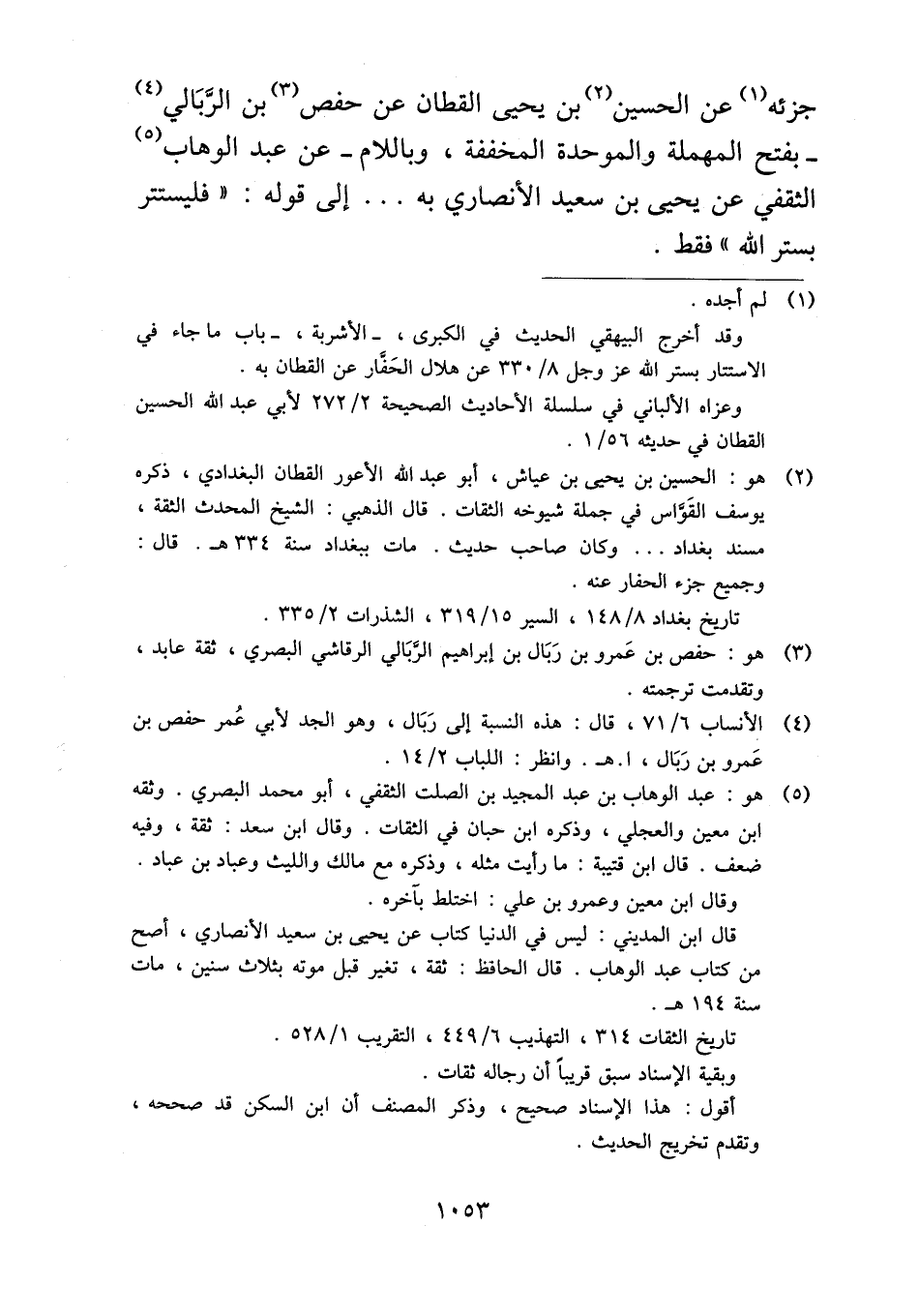 جزئه عن الحسين بن يحيى القطان عن حفص بن الرَّبَالي -بفتح المهملة والموحدة المخففة، وباللام- عن عبد الوهاب الثقفي عن يحيى بن سعيد الأنصاري به ... إلى قوله: "فليستتر بستر الله" فقط.