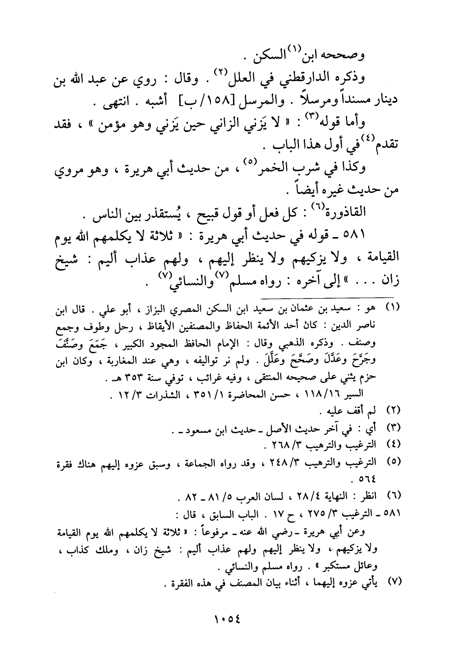 ٥٨١ - قوله في حديث أبي هريرة: "ثلاثة لا يكلمهم الله يوم القيامة، ولا يزكيهم ولا ينظر إليهم، ولهم عذاب أليم: شيخ زان ... " إلى آخره: رواه مسلم والنسائي).