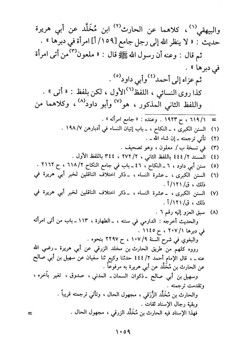 والبيهقي، كلاهما عن الحارث ابن مُخَلَّد عن أبي هريرة حديث: "لا ينظر الله إلى رجل جامع امرأة في دبرها".