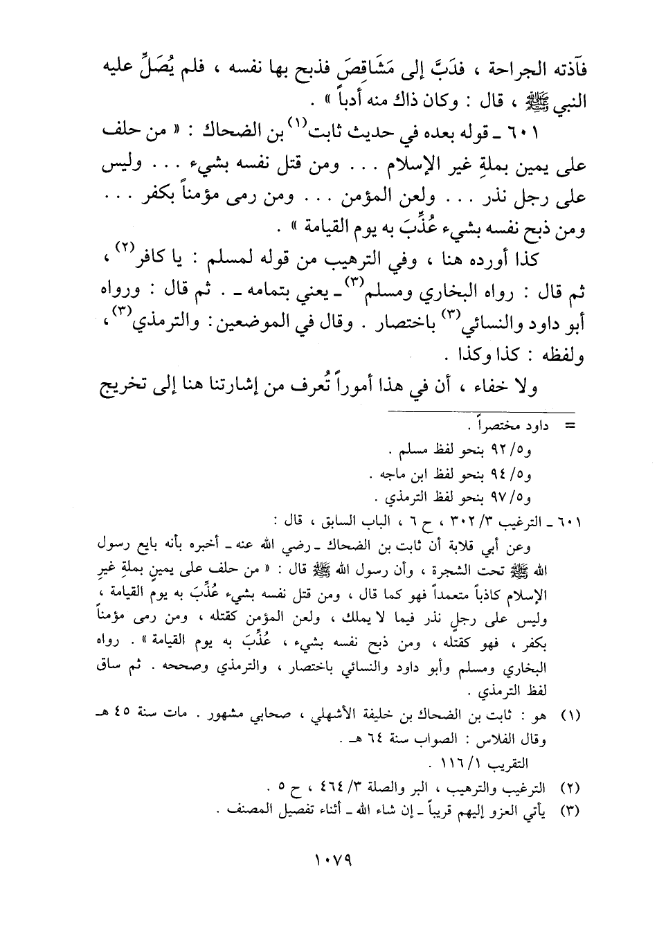 ٦٠١ - قوله بعده في حديث ثابت بن الضحاك: "من حلف على يمين بملةِ غير الإسلام ... ومن قتل نفسه بشيء ... وليس على رجل نذر ... ولعن المؤمن ... ومن رمى مؤمناً بكفر ... ومن ذبح نفسه بشيء عُذِّبَ به يوم القيامة".