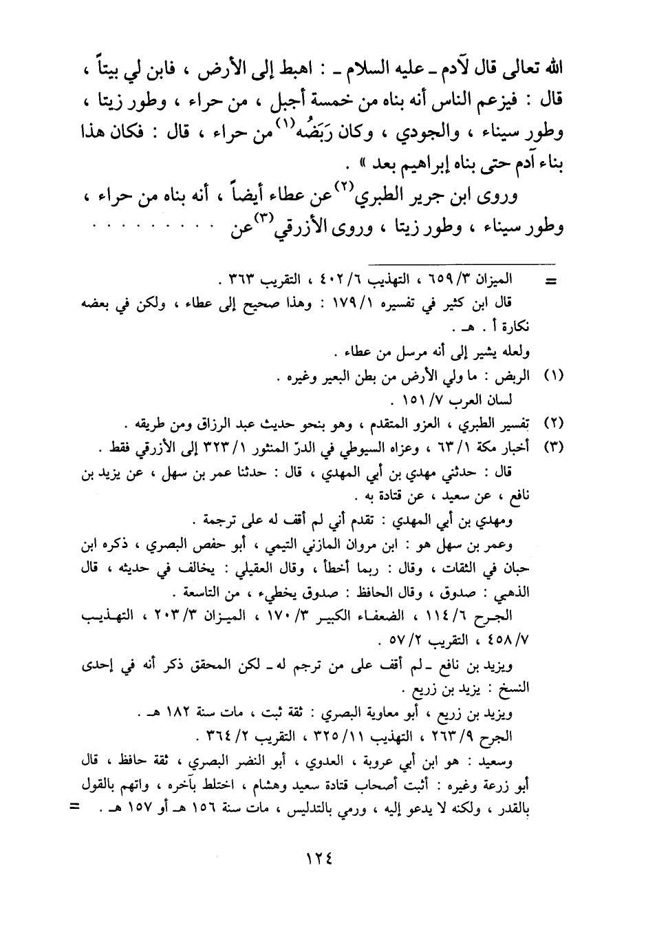 وروى ابن جرير الطبري عن عطاء أيضاً، أنه بناه من حراء، وطور سيناء، وطور زيتا، وروى الأزرقي عن