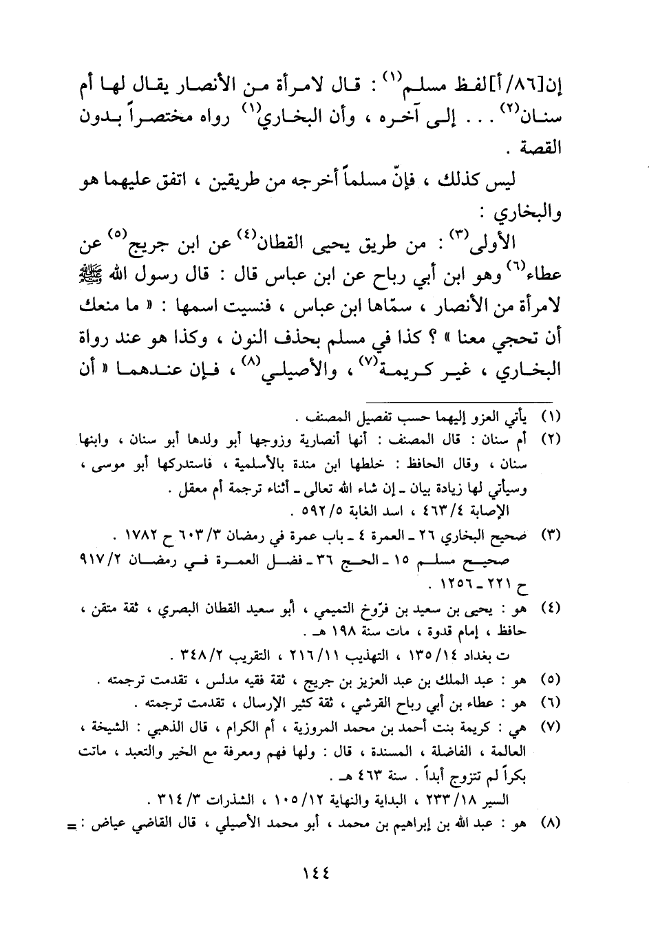 الأولى: من طريق يحيى القطان عن ابن جريج عن عطاء وهو ابن أبي رباح عن ابن عباس قال: قال رسول الله - صلى الله عليه وسلم - لامرأة من الأنصار، سمّاها ابن عباس، فنسيت اسمها: "ما منعك أن تحجي معنا"؟ كذا في مسلم بحذف النون، وكذا هو عند رواة البخاري، غير كريمة، والأصيلي، فإن عندهما "أن