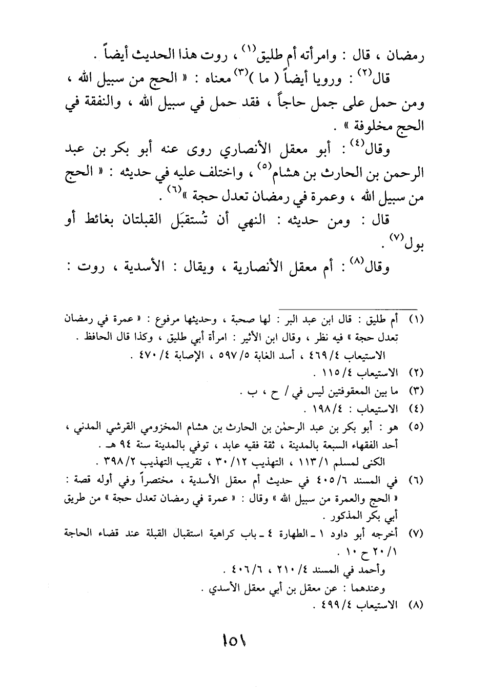 قال: ورويا أيضاً (ما) معناه: "الحج من سبيل الله، ومن حمل على جمل حاجاً، فقد حمل في سبيل الله، والنفقة في الحج مخلوفة".