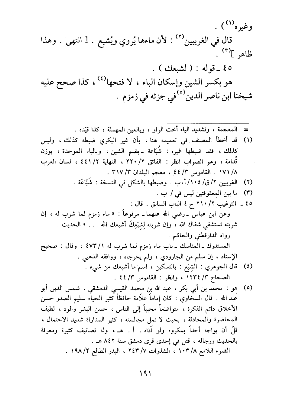هو بكسر الشين وإسكان الباء، لا فتحها، كذا صحح عليه شيخنا ابن ناصر الدين في جزئه في زمزم.