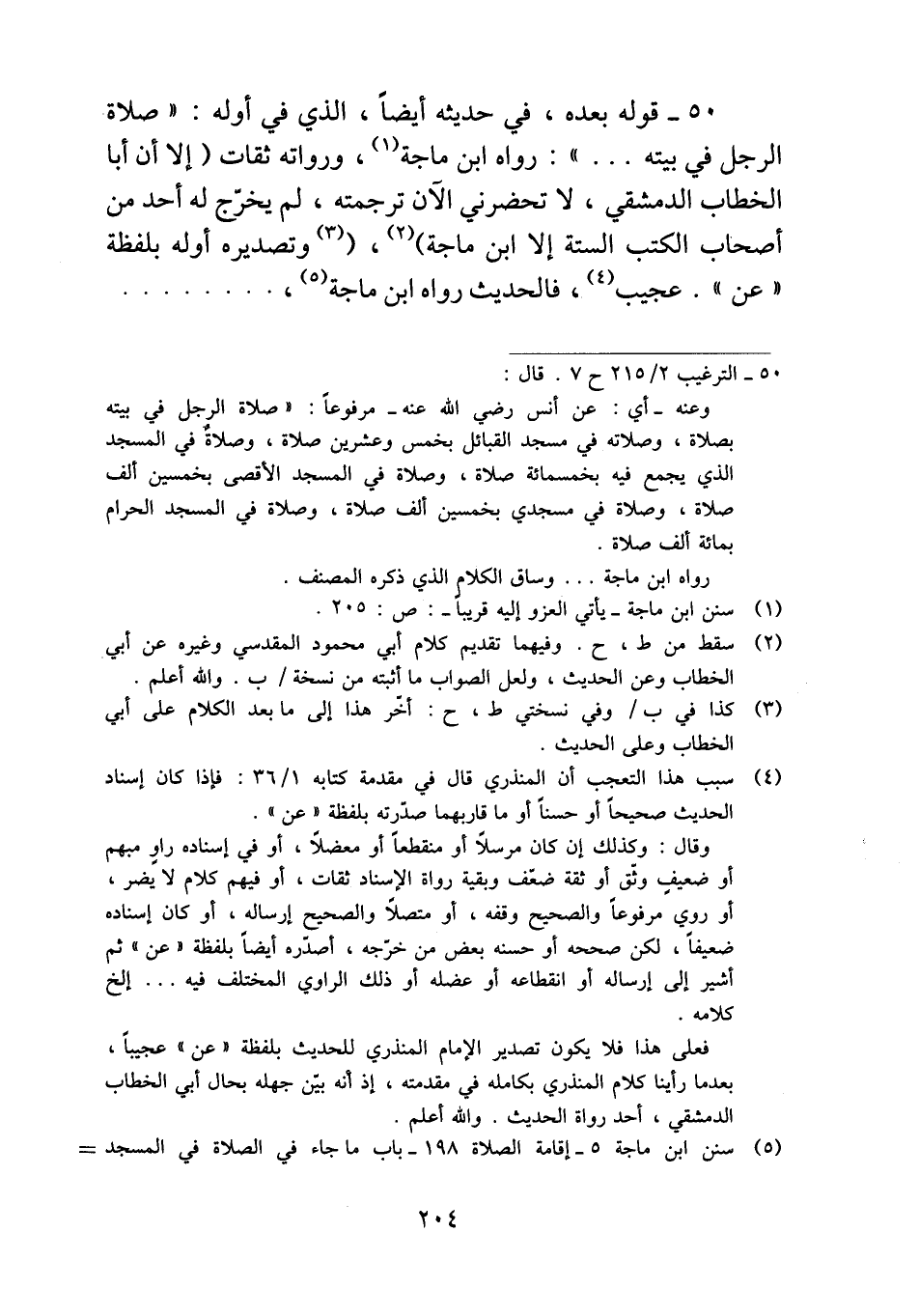 ٥٠ - قوله بعده، في حديثه أيضاً، الذي في أوله: "صلاة الرجل في بيته ... ": رواه ابن ماجة، ورواته ثقات (إلا أن أبا الخطاب الدمشقي، لا تحضرني الآن ترجمته، لم يخرّج له أحد من أصحاب الكتب الستة إلا ابن ماجة)، (وتصديره أوله بلفظة "عن". عجيب، فالحديث رواه ابن ماجة ,