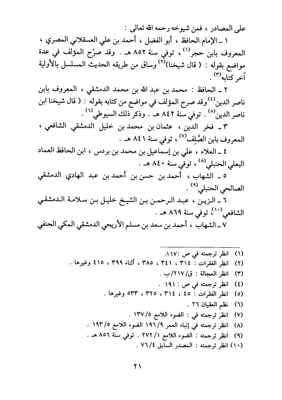 ٦ - الزين، عبد الرحمن بن الشيخ خليل بن سلامة الدمشقي الشافعي (١٠) , توفي سنة ٨٦٩ هـ.