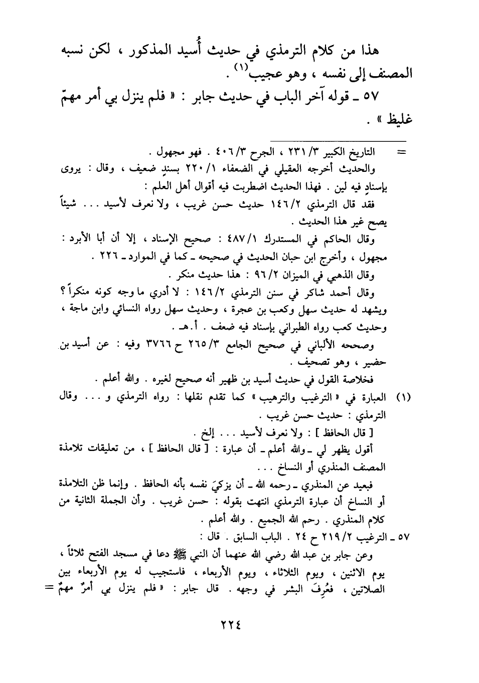 هذا من كلام الترمذي في حديث أُسيد المذكور، لكن نسبه المصنف إلى نفسه، وهو عجيب.