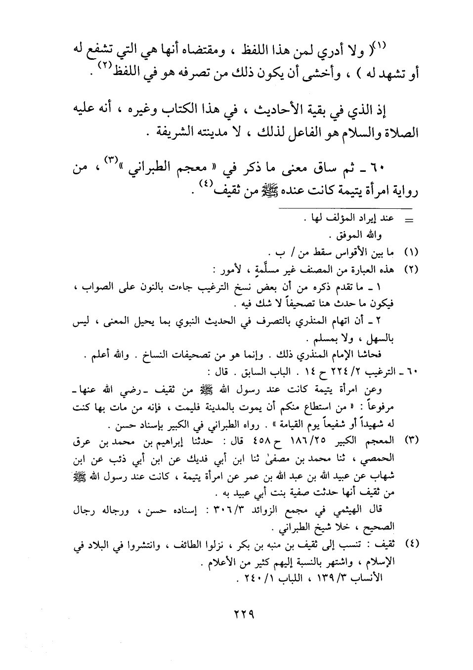 ٦٠ - ثم ساق معنى ما ذكر في "معجم الطبراني"، من رواية امرأة يتيمة كانت عنده - صلى الله عليه وسلم - من ثقيف.