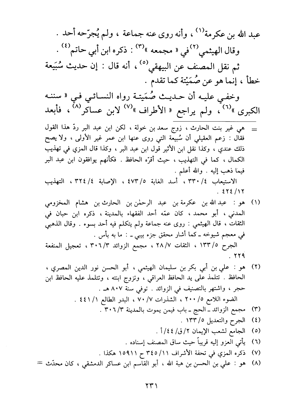 ثم نقل المصنف عن البيهقي، أنه قال: إن حديث سُبَيعة خطأ، إنما هو عن صُمَيْتة كما تقدم.