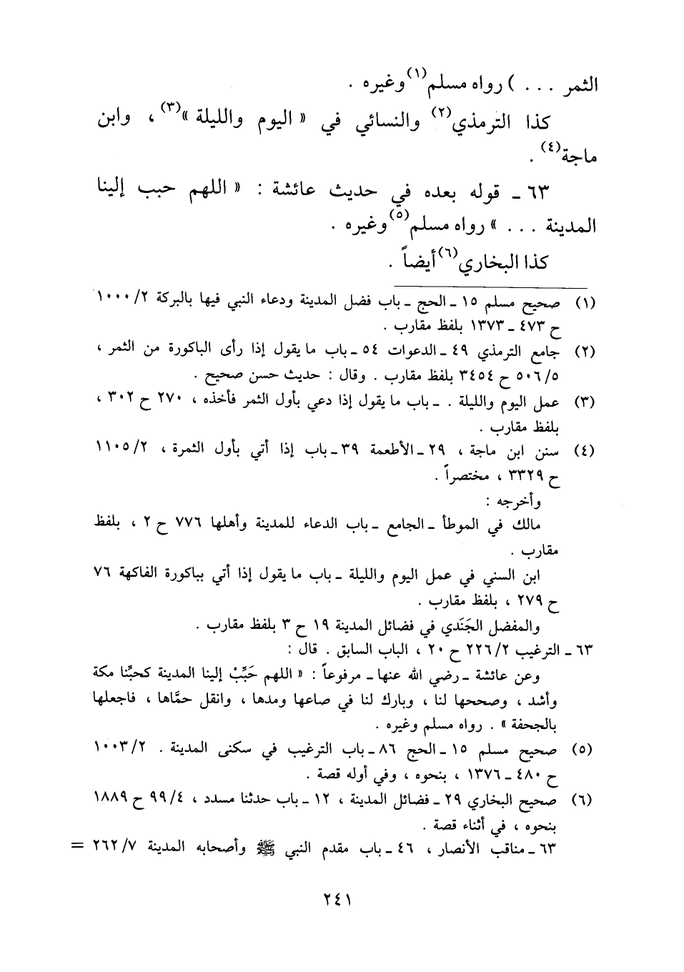 ٦٣ - قوله بعده في حديث عائشة: "اللهم حبب إلينا المدينة ... " رواه مسلم وغيره.