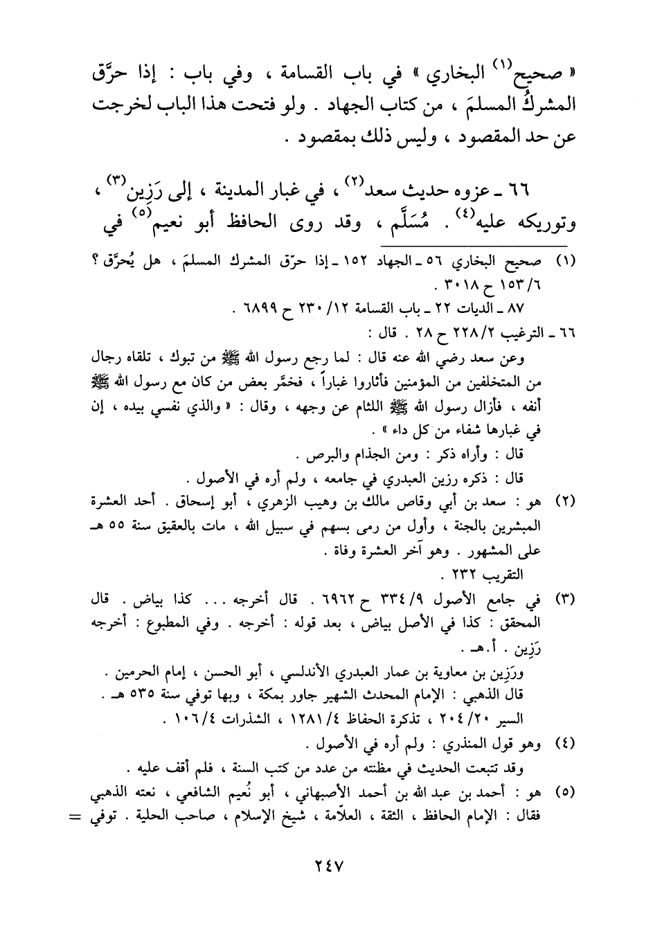 ٦٦ - عزوه حديث سعد، في غبار المدينة، إلى رَزِين، وتوريكه عليه. مُسَلَّم، وقد روى الحافظ أبو نعيم في