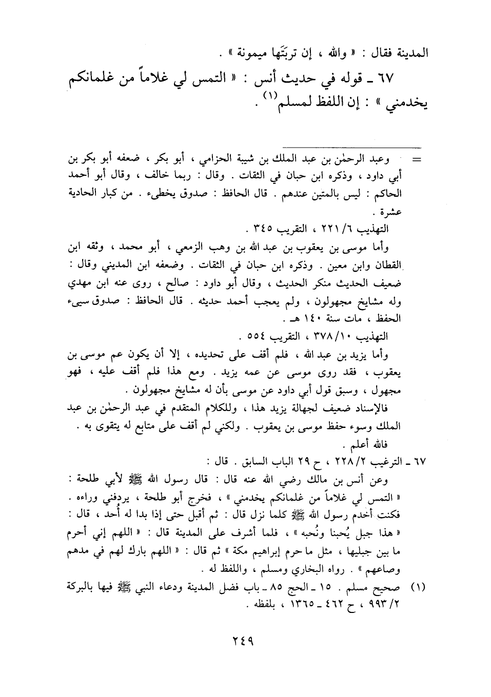 ٦٧ - قوله في حديث أنس: "التمس لي غلاماً من غلمانكم يخدمني": إن اللفظ لمسلم.