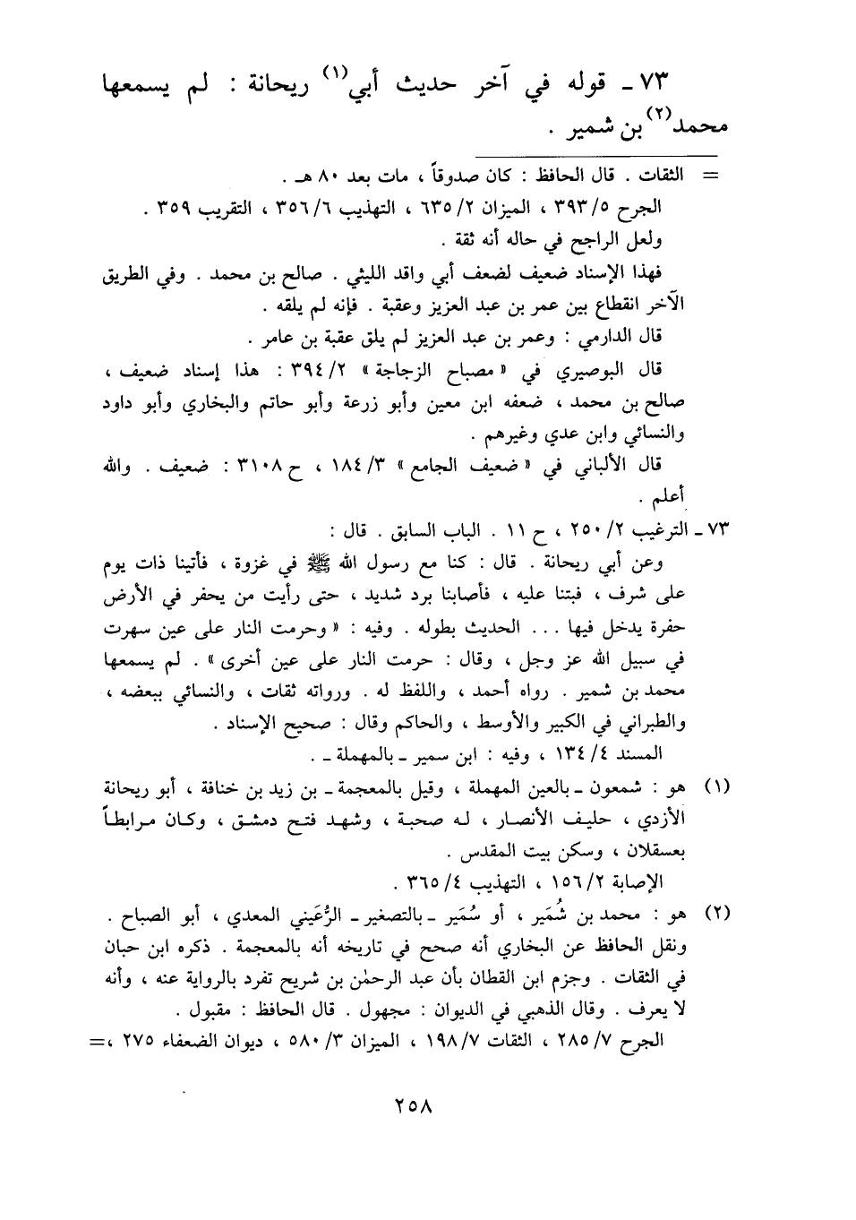 ٧٣ - قوله في آخر حديث أبي ريحانة: لم يسمعها محمد بن شمير.