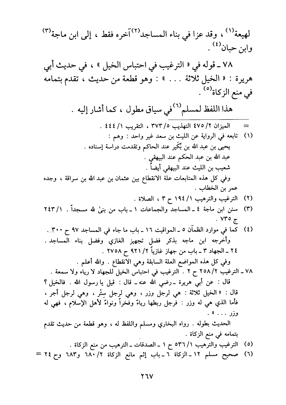 ٧٨ - قوله في "الترغيب في احتباس الخيل"، في حديث أبي هريرة: "الخيل ثلاثة ... ": وهو قطعة من حديث، تقدم بتمامه في منع الزكاة.