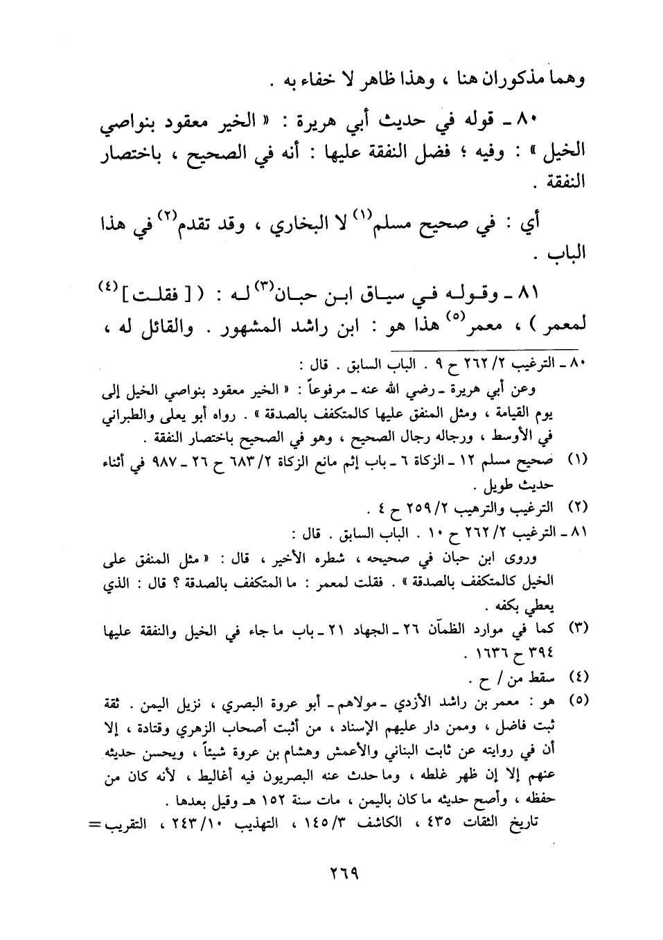 ٨٠ - قوله في حديث أبي هريرة: "الخير معقود بنواصي الخيل": وفيه؛ فضل النفقة عليها: أنه في الصحيح، باختصار النفقة.